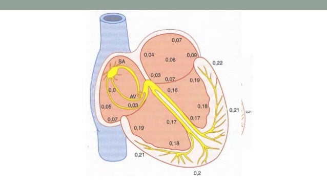 El tiempo que transcurre desde la entrada del impulso electrico a las ramas del haz de His hasta que este alcanza las porciones terminales en el promedio de 0.03 seg. El potencial de accion transmite por las fibras musculares ventriculares a una velocidad de 0.3 a 0.5 m/seg y se propaga en direccion endocardio a epicardio. el tiempo total de transmision del potencial de accion desde la entrada al haz de His hasta las fibras musculares del ventriculo es de 0.06 seg.